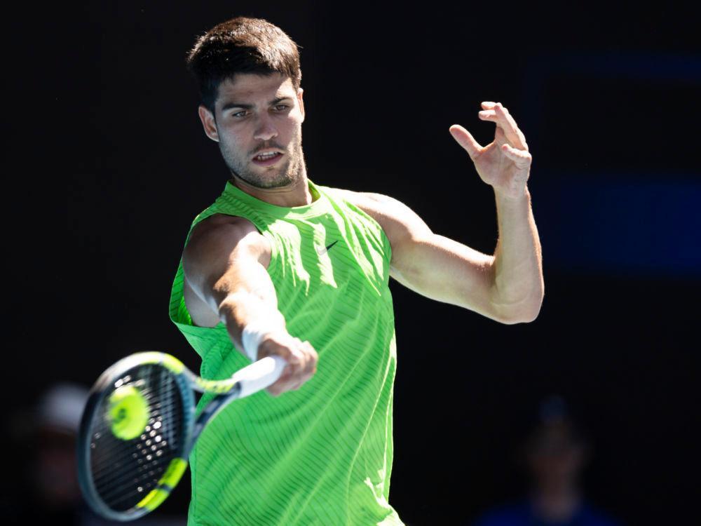 1月23日,阿尔卡拉斯在比赛中回球。新华社发(胡泾辰 摄)
